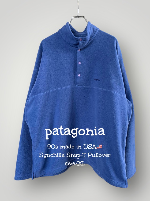 patagonia 90s made in USA Synchilla Snap-T Pullover size/XL 初期復刻の珍しいモデルのスナップ T☺️ パッと見は、 パタゴニア定番のスナップ T。 だけど今回のこのモデルは、 貴重な「胸ポケットなし」の 初期復刻デザイン。 通常のスナップT"25450"は、 は左胸にフラップ付きのポケットあり。 この"26250"はポケットがないモデル。 これは1980年代に初めて作った 初期型スナップTのディテールを、 1990年代後半に再現した限定的なモデル。 そして、パタゴニアがアメリカ製で 作っていた晩年のモデルって言うのも なんか嬉しいポイント☺️ 今年トレンドの ブルー、グリーン、パープル。 そんな色で探していた時に、 全部混ぜた様な 現行にはまず無い様な 色合いが良い調子良いフリースです。 昔はブライトブルーって言われた パタゴニアでも珍しい色合い。 刺繍ロゴも、 現行の胸にロゴパッチではなく、 直接「patagonia」と刺繍されているのが この年代の特徴。 背中のV字の切り替え。 背中に大きな「V字」のステッチラインが 入っています。これは当時のスナップTの中でも 特定のラインに見られる凝ったディテールです。 (ゼン・タートルなど人気柄物シリーズと同じ裁断) そんな初期復刻モデルの珍しいスナップ T。 そして状態も良く、 程良く縮みでて丈は良い感じに 今着たい短丈シルエット。 調子良いフリース。 春までコレ1枚あれば アウター無しで着れるので メチャクチャオススメです。 是非着画の確認、宜しくお願いします☺️ 写真 1〜10枚目迄商品写真 11枚目以降はスタイリング写真 肩幅 68㎝ 袖丈 58㎝ 身幅 75㎝ 着丈 74㎝ 着用者(171㎝ 肩幅広め)