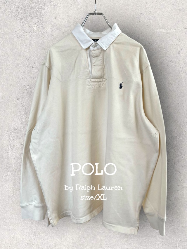 POLO by Ralph Lauren 90s size/XXL/XL Aラインのシルエット可愛いラガーシャツ ☺️ ラルフローレンのラガーシャツ 。 定番の濃紺と珍しい生成り。 現行の縦長のシルエットじゃ無く、 着た時のAラインのシルエットが可愛い。 この年代の物だからこそ このシルエットが良いって思える ラガーシャツ 。 それぞれ色も良いし、 サイズも良い。 定番だからこそ、 今気分のシルエットで着たい。 腕周りもタップリして雰囲気良いし、 何よりラガーシャツらしい、 ガッシガシの生地なので、 今から洗って 更にクタッとした雰囲気になるのが、 楽しみなラガーシャツ ☺️ この時期のラルフは 生地がとにかく肉厚でタフ。 今の現行品よりも ガシガシ着込んでに クッタクタにするのに最適なアイテム。 「ショルダーパッチ(肩のステッチ)」が、 激しい接触があるラグビー競技での 保護を目的としたディティールです。 ファッション要素と実用性を備えた 調子良いラガーシャツ。 生成りはチノパン合わせで、 オフホワイトワントーン。 そしてデニムやチノパンの、 NAVYワントーンスタイリングも、 個人的にメチャクチャオススメです! 是非着画で、サイズ感の確認も 宜しくお願いします☺️ 写真 1〜13枚目迄商品写真 14枚目以降はスタイリング写真 ※写真13枚目、NAVYの首裏シミあり OFF WHITE 肩幅 55㎝ 袖丈 63㎝ 身幅 74㎝ 着丈 78㎝ NAVY 肩幅 59㎝ 袖丈 66㎝ 身幅 75㎝ 着丈 80㎝ 着用者(171㎝ 肩幅広め)