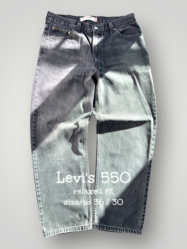 Levi's 550 "relaxed fit" size/ w 36 l 30 アタリの雰囲気良いゆるめ炭黒デニム☺️ 綺麗にアタリの入った炭黒デニム。 バルーン型の丸いシルエットが良い。 リーバイス550のリラックスフィット。 リーバイス 550には、 大きく分けて4つの形があって、 個人的には、このリラックスフィットが 1番好きな形。 適度なシワ感に色落ち。 雰囲気良いブラックデニム。 デニムの良い雰囲気になっています。 絶妙な「後染め」ブラック。 この真っ黒すぎない、 少しグレーがかったスミ黒のような色落ち。 「ブラックデニム」の雰囲気良い所。 新品には無い、 使い込まれた綿100の クッタリ感が良い! 黒ワントーンで着て、 適度に黒のグラデーションが出来る、 フェードの調子良いデニム。 そしてレングス30は、 171cmの自分でもお直し無しで穿けるし、 腰で穿けばワンクッションにもなる。 裾のアタリも雰囲気良い☺️ トップスはリラックスしたサイズも良いし、 ジャストサイズにゆるめデニム。 色々なスタイリング楽しめるデニム。 オススメです! 是非着画の確認も宜しくお願いします☺️ 写真 1〜9枚目迄商品写真 10枚目以降はスタイリング写真 ウエスト 93㎝ 股上 32㎝ 股下 75㎝ わたり 33㎝ 裾幅 22㎝ 着用者(171㎝ 肩幅広め)