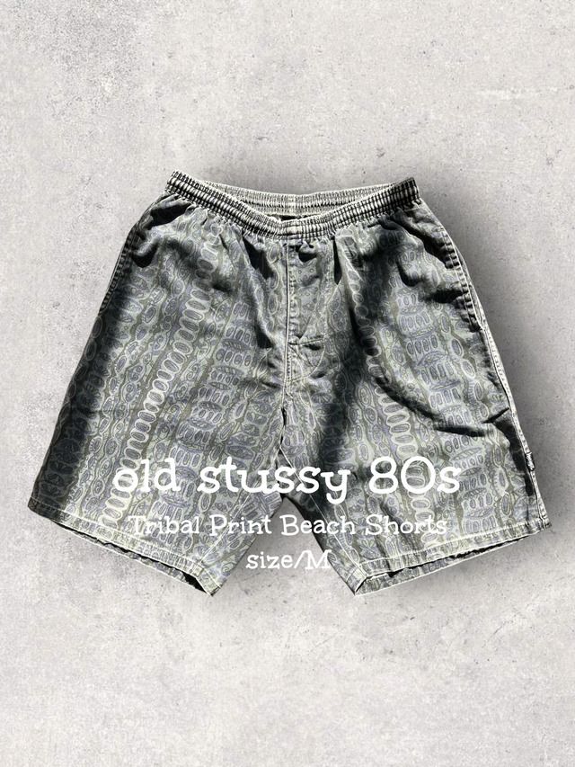 old stussy 80s tribal print beach shorts size/M フェードのトライバル柄ショーツ☺️ "old stussy"と言えばなトライバル柄。 今気分のフェード感のある短パン。 とりあえず雰囲気最高の短パン。 今回の総柄は、 ショーン・ステューシーが好んだ 「アフリカン・トライバル(民族模様)」 や 「アステカ柄」 を、 80年代らしいグラフィックへと昇華。 ブランド始まったばかりの80年代は、 アフリカのテキスタイルや、 オーストラリアのアボリジニ・アートから インスピレーションを受けたアイテムが多く、 今となってはメチャクチャ人気のアイテム。 元々サーフボードに手書きして人気になる。 そんな個人のブランドから始まったブランドなので、 ブランド最初の80年代は、 プリントでも手の込んだ手書き風の トライバルプリント。 現代だと、こんな手書き風のプリントは出来ず、 この時代だからこそ出来ていた この手の"old stussy"のアイテム。 数も少なくメチャクチャ人気です。 サイズMのビーチショーツ。 大き過ぎず、小さ過ぎず。 調子良いサイズ感です。 是非着画含めて確認、 宜しくお願いします☺️ 写真 1〜7枚目迄商品写真 8枚目以降はスタイリング写真 ウエスト 74〜88㎝ 股上 29㎝ 股下 25㎝ わたり 33㎝ 裾幅 28㎝ 着用者(171㎝ 肩幅広め)