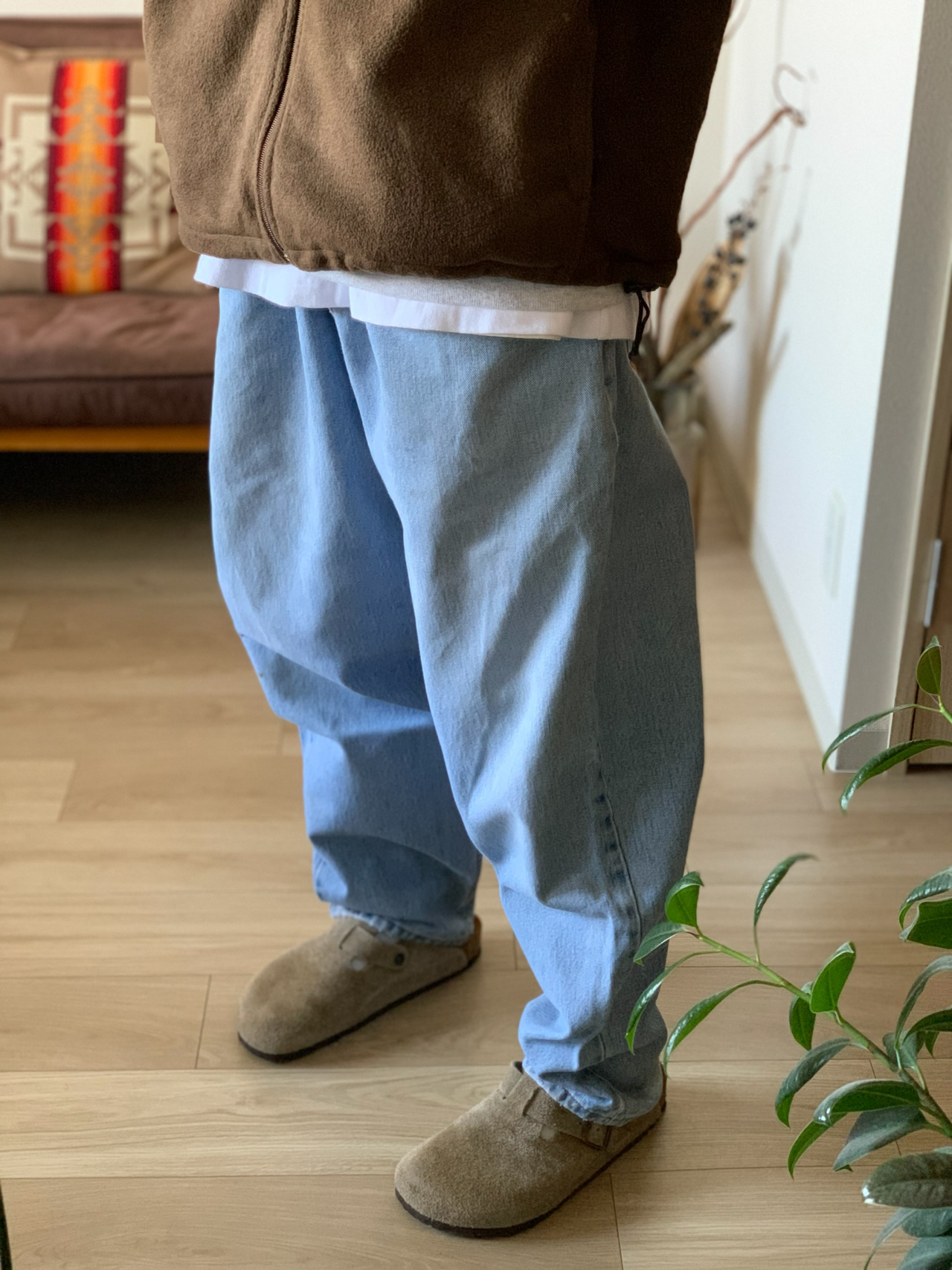 薄い色のデニムでボリュームある物探して、