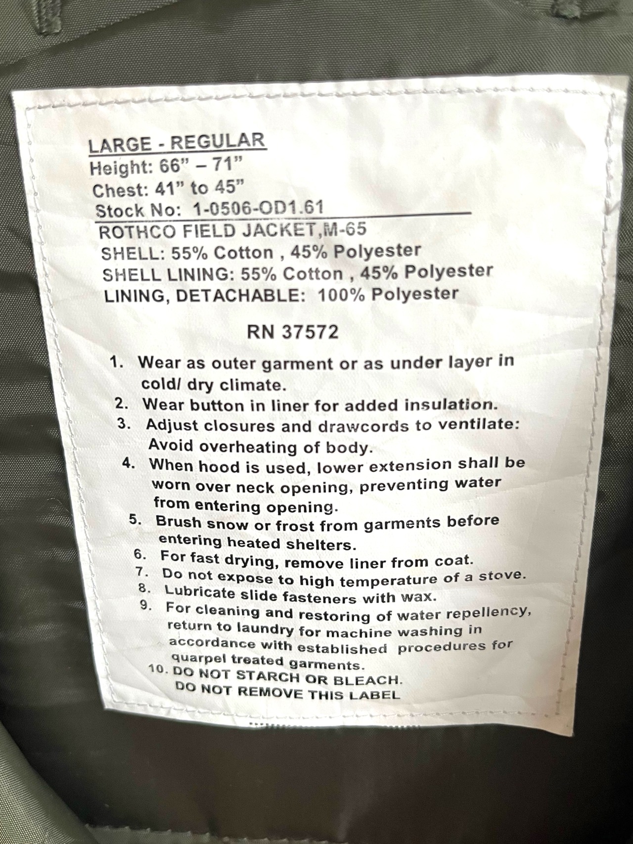 ROTHCO FIELD JACKET M-65 LINER size/LARGE-REGURAR