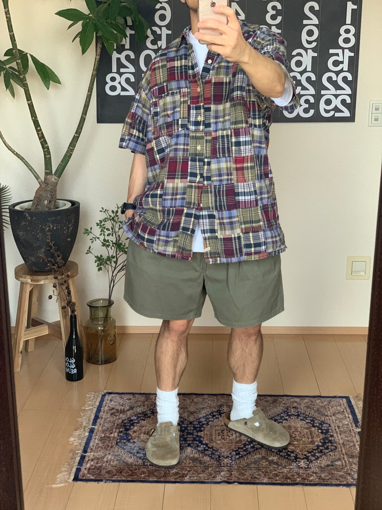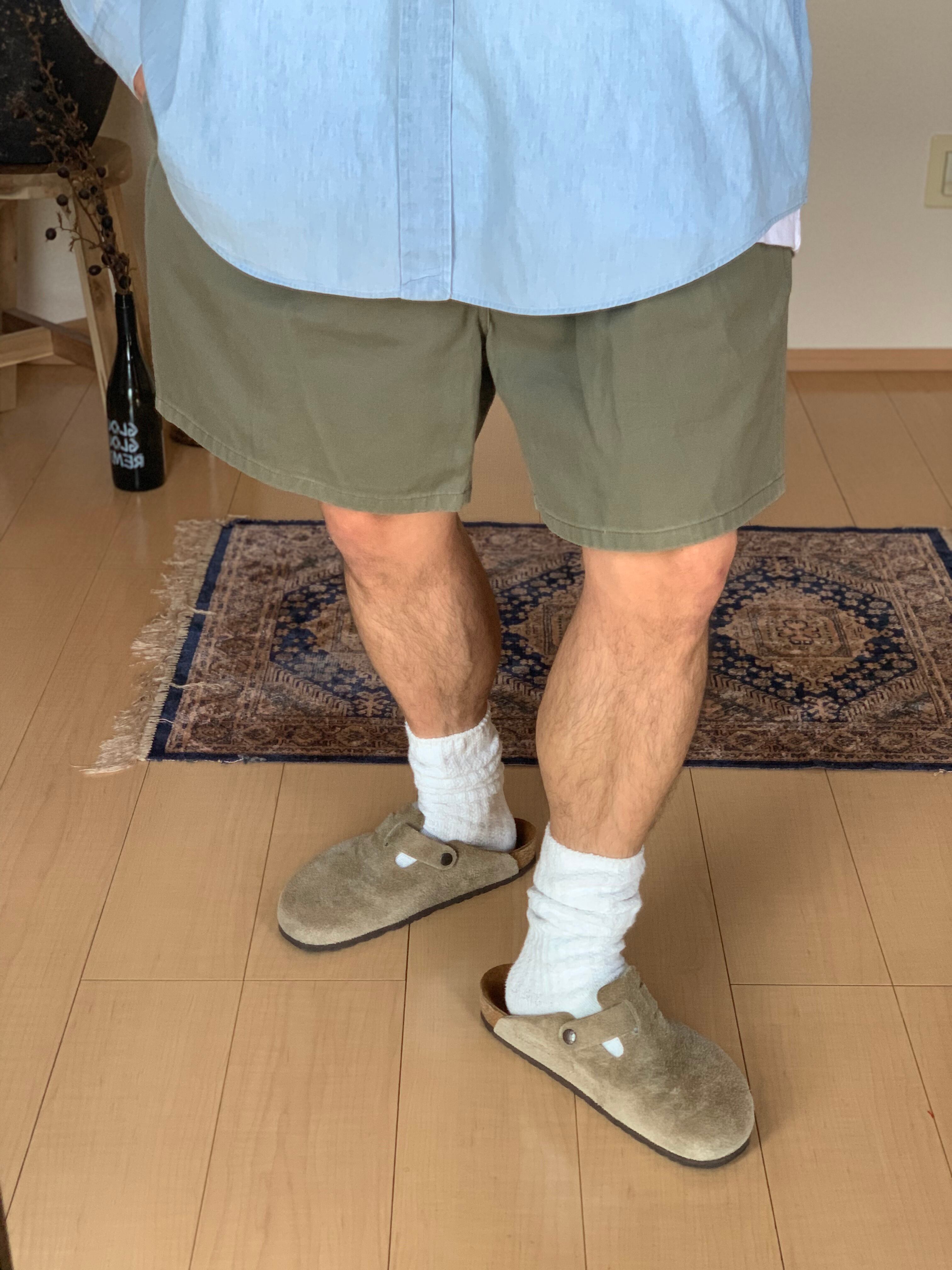 白、グレー、黒にオリーブの短パン。